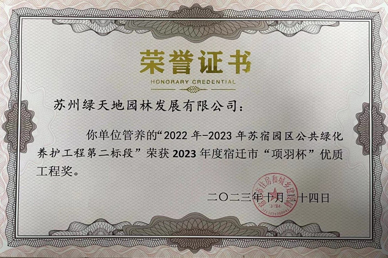 近日,由宿遷市蘇宿園區(qū)建設發(fā)展有限公司負責管理的蘇宿工業(yè)園區(qū)2022-2023年公共綠化養(yǎng)護工程第一、二標段,同時榮獲2023年度宿遷市“項羽杯”優(yōu)質工程獎。