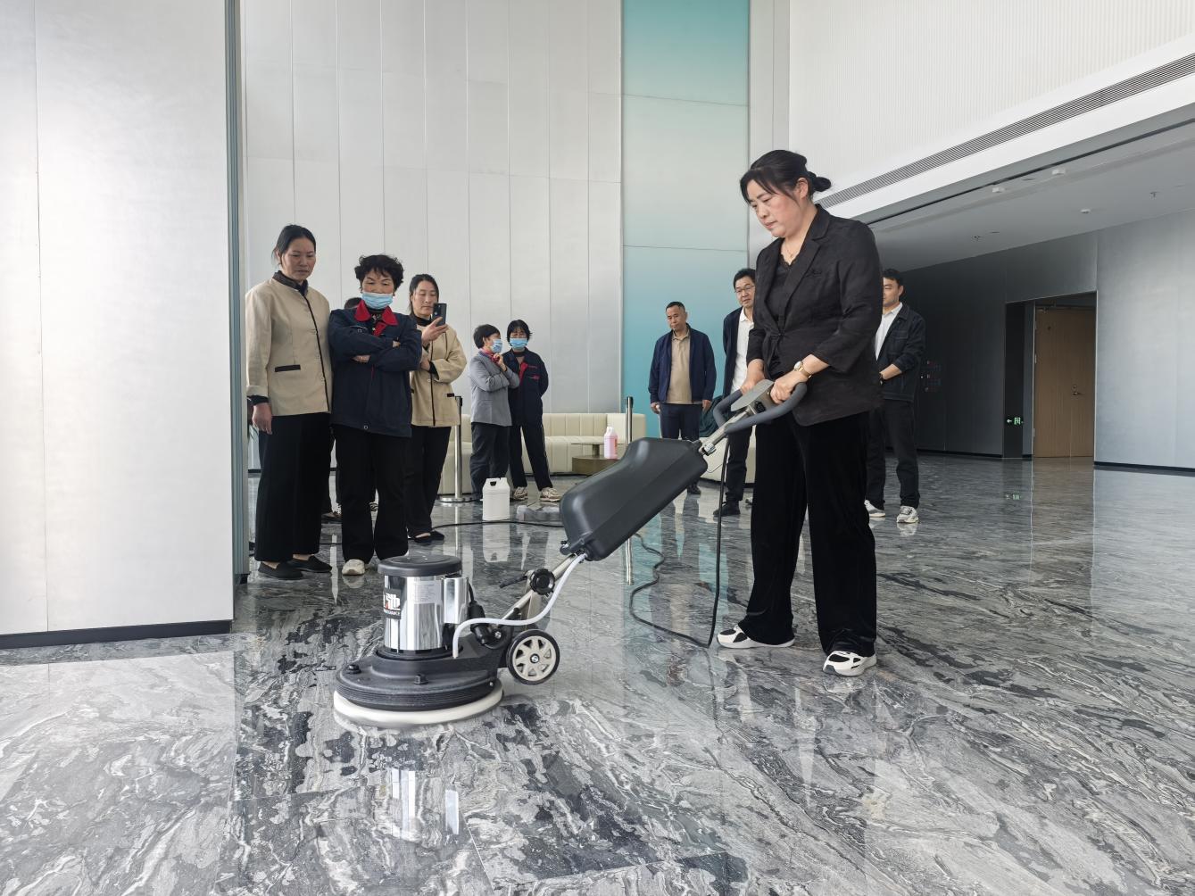 培訓(xùn)圍繞辦公大樓地面清掃、電梯轎廂清潔保養(yǎng)、玻璃幕墻清洗維護(hù)、會(huì)議室、茶水間及衛(wèi)生間細(xì)節(jié)處理到外圍路面和綠化區(qū)域的日常清理管養(yǎng)等內(nèi)容,通過觀看視頻和現(xiàn)場演示方式,詳細(xì)講解了操作規(guī)范和作業(yè)標(biāo)準(zhǔn),確保保潔人員能夠熟練掌握高效、科學(xué)的清潔技巧,提高工作質(zhì)量與效率。