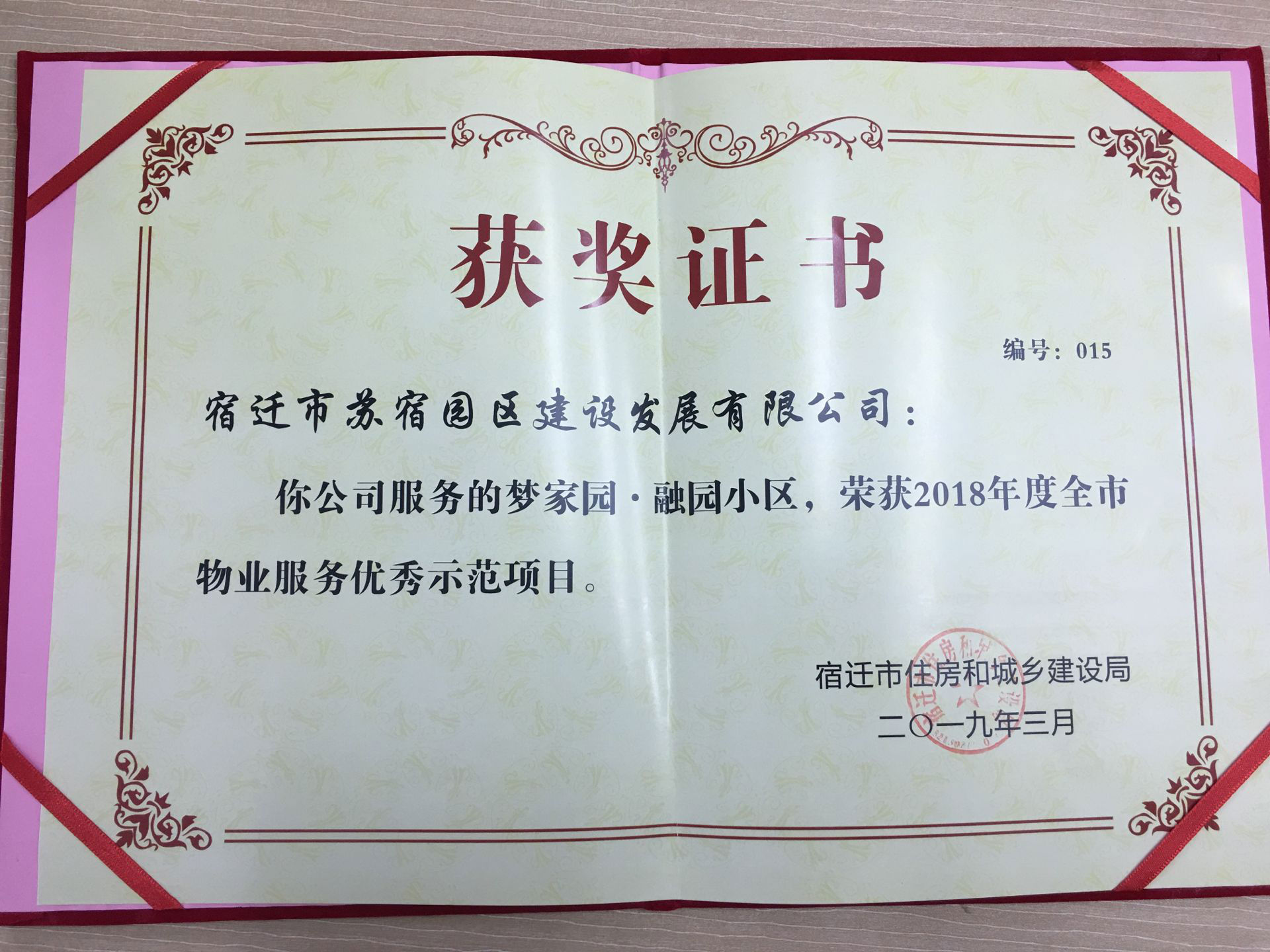 2018年12月,在宿遷市房管局及市物業(yè)管理協(xié)會(huì)組織的全市物業(yè)管理項(xiàng)目考核評(píng)比活動(dòng)中,夢(mèng)家園.融園喜獲“2018年度全市物業(yè)服務(wù)優(yōu)秀示范項(xiàng)目”。