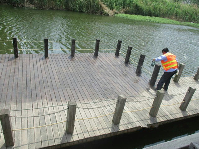 維保工作首先從為民河公園開始。為民河公園于2012年12月竣工投入使用,為園區(qū)最早建成的景觀公園之一。公園內(nèi)有賈拉木棧道約570平方米,硬木扶手、欄桿約402米。隨著使用年限增加,公園部分設(shè)施特別是木棧道、親水平臺等逐漸發(fā)生了老化,木材表面出現(xiàn)不同程度的褪色和裂紋,影響了親水平臺的景觀效果。為此,公司先安排維保人員對破損處進(jìn)行維修,然后清掃干凈噴漆,待自然晾干后再開放通行,給親水平臺穿上了新“嫁衣”。