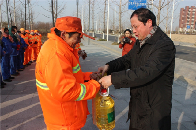在慰問(wèn)現(xiàn)場(chǎng),周原與城市維護(hù)工人親切握手,并向他們送上了米、面、油等慰問(wèn)品,感謝他們一直以來(lái)為園區(qū)城市維護(hù)工作付出的辛勤勞動(dòng),并衷心祝愿他們春節(jié)快樂(lè)、身體健康、闔家幸福。